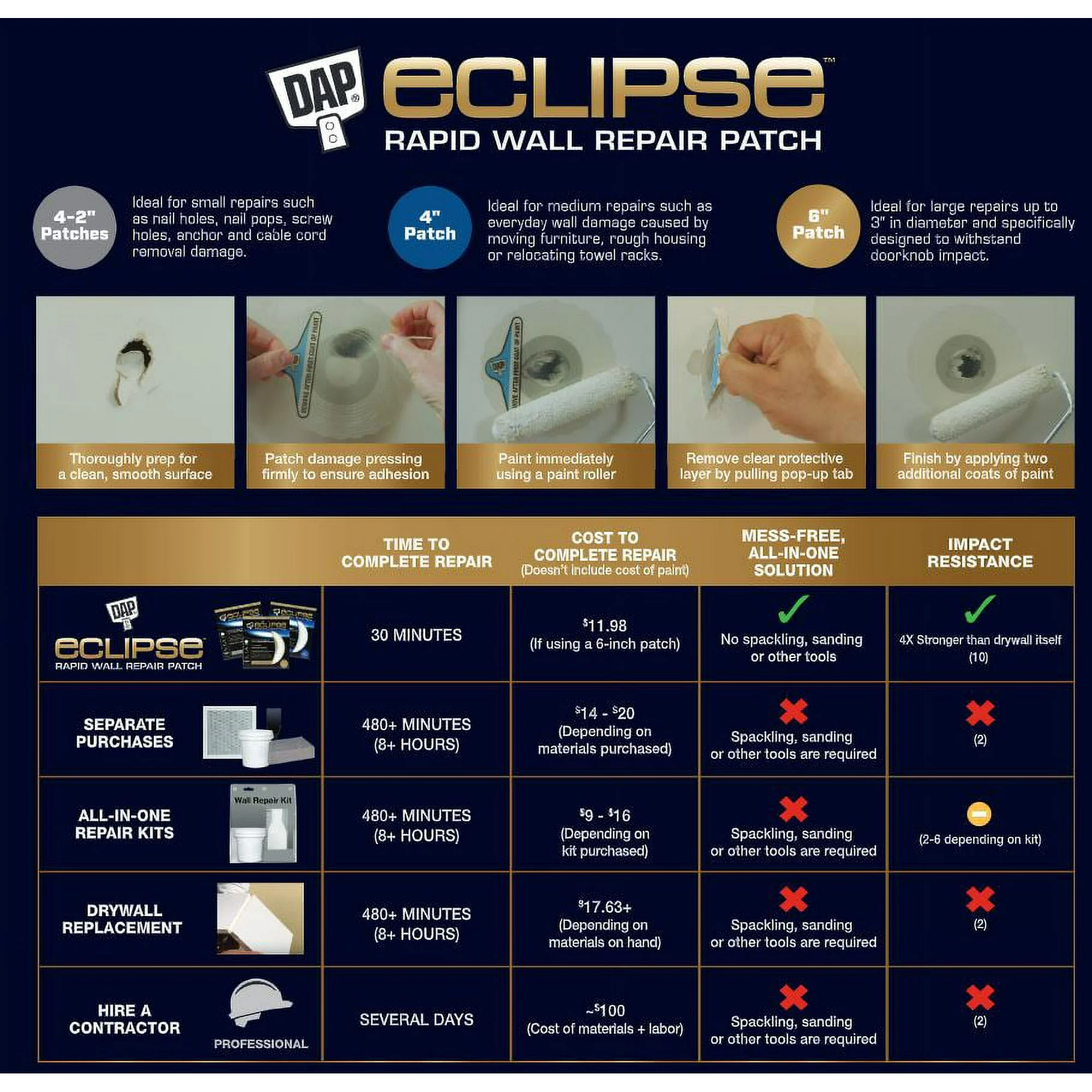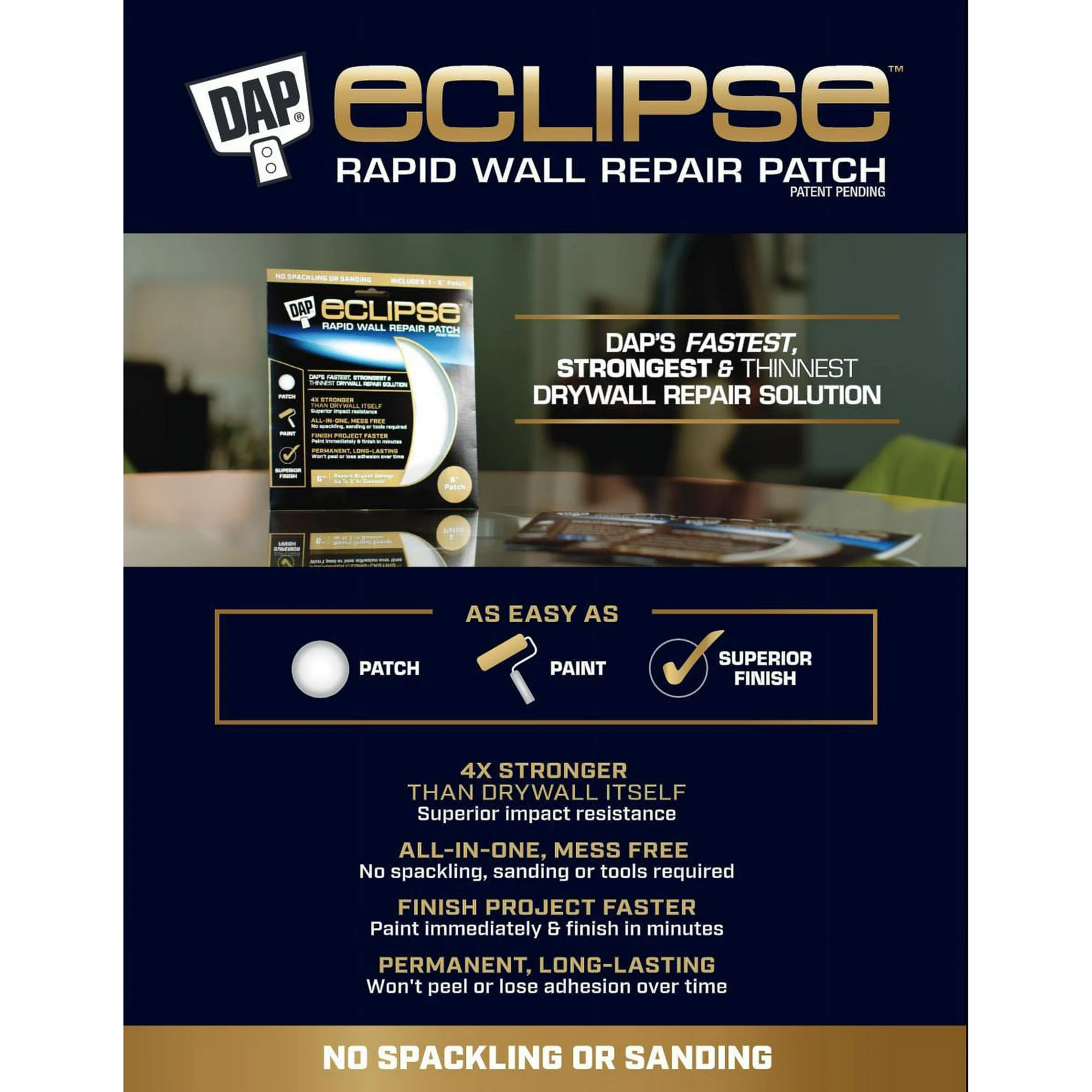 The DAP Eclipse Rapid Wall Repair Patch is the fastest, strongest, and thinnest drywall repair solution available. Whether you're fixing small dents, holes, or cracks, this all-in-one patch allows you to get the job done in no time—no tools, sanding, or mess required.